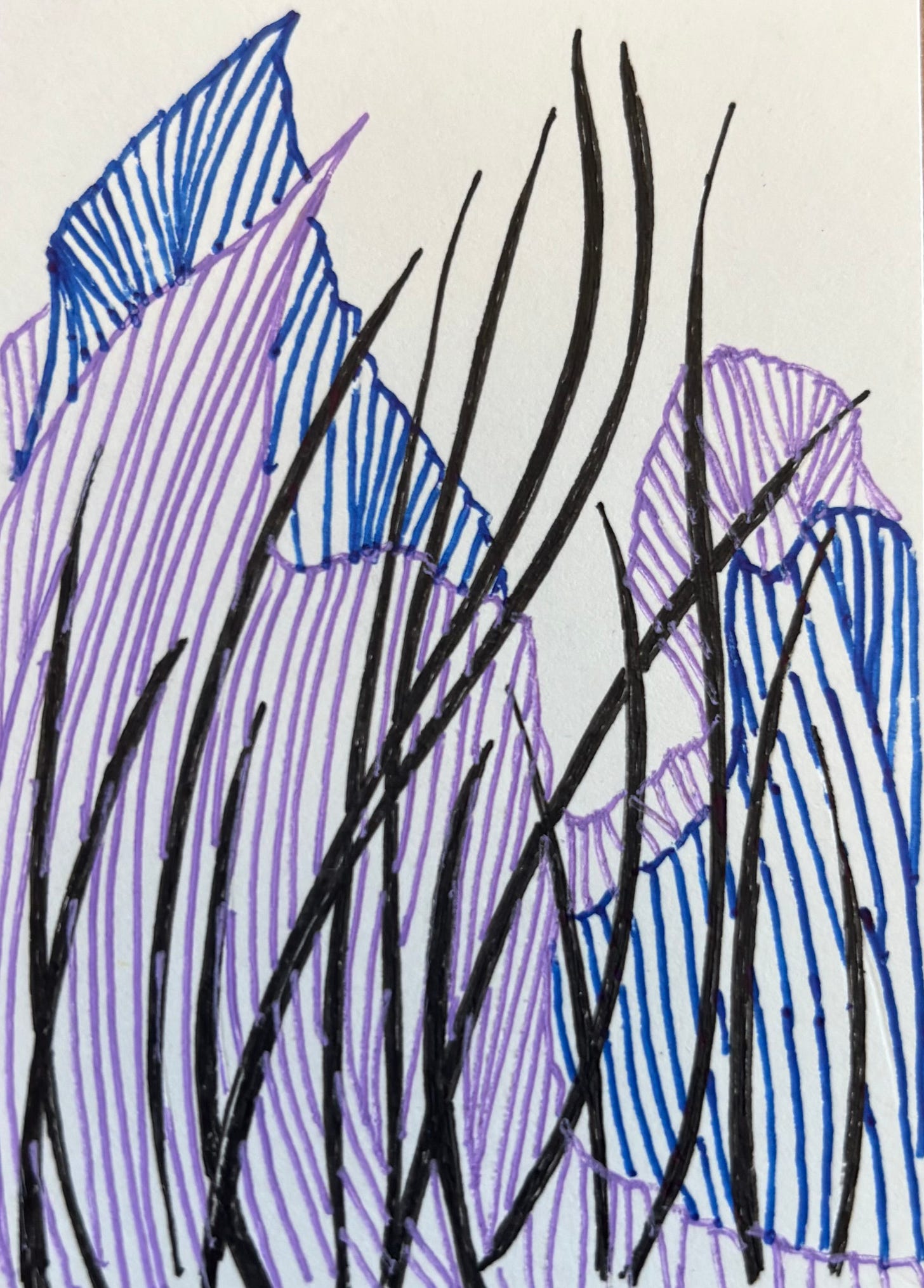 I start something because it’s the only thing I can start, and in that limitation, something opens. These 2.5 x 3.5-inch drawings are their own kind of meditation—tiny, demanding, impossible to fake. Every line matters. Every mistake shows. And maybe that’s the point.
